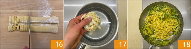 Cortad los rollos en tiras de unos 5 mm de ancho 16. Sumergid las tagliatelle en abundante agua hirviendo con sal 17. Una vez cocidas, escurridlas, trasladadlas a la sartén y salteadlas durante unos minutos 18.