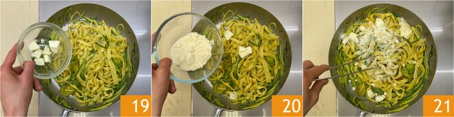 Apagad el fuego, añadid la mantequilla 19, el parmesano rallado 20 y mezclad bien 21.