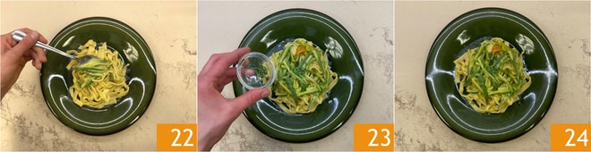 Emplatad 22 y completad con tomillo fresco 23. Las tagliatelle con flores de calabacín están listas para ser degustadas 24.
