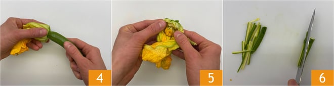Mientras tanto, separad los calabacines de las flores 4, eliminad el pistilo de las flores 5 y cortad los calabacines en juliana 6.