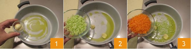Para preparar las tagliatelle al ragú blanco comenzad con el sofrito. En una cacerola, calentad el aceite con un diente de ajo y dejadlo dorar 1. Agregad el apio 2 y la zanahoria finamente picados 3.