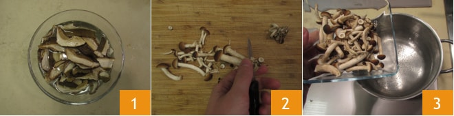 Para preparar las tagliatelle al ragú de setas y frutos secos, comenzad poniendo los porcini en remojo. Echadlos en un bol lleno de agua fresca 1. Mientras tanto, limpiad las setas de cardo: eliminad la parte terrosa 2 y luego enjuagadlas. Finalmente, escaldadlas durante unos 15 minutos 3.