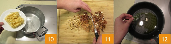 Mientras tanto, poned al fuego una olla en la que cocer la pasta 10 y mientras tanto preparar el resto: picad los frutos secos 11. En una sartén, verted un poco de aceite y aromatizad con ajo y romero 12,