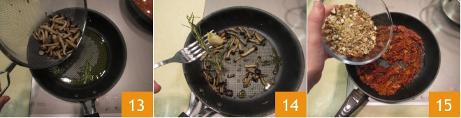 a continuación, escurrid las setas de cardo que a este punto deberían estar cocidas 13. Sazonad rápidamente y eliminad el ajo y el romero 14. También la salsa a este punto debería estar lista, añadid 3/4 de la mezcla de frutos secos 15
