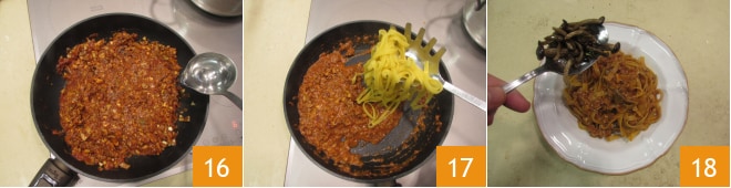 y, si es necesario, alargad con un chorrito de agua de cocción de la pasta 16. Luego, escurrid las tagliatelle y mezclad 17. Servid echando la pasta en los platos y decorando con las setas de cardo 18.