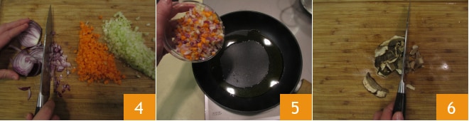 Mientras tanto, limpiad y picad finamente con un cuchillo la cebolla, el apio y la zanahoria 4. En una sartén, calentad un buen chorro de aceite y luego echad el picadillo. Dejad que se ablande a fuego lento durante unos diez minutos 5. Mientras tanto, escurrid los porcini y picadlos groseramente 6.