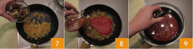 En este punto, el sofrito debería estar ablandado, añadid los porcini y ajustad la sal 7, a continuación, incorporad la salsa de tomate 8, enjuagad la jarra añadiendo así un chorrito de agua a la salsa, y cubrid dejando cocinar durante 15 minutos con la tapa 9.