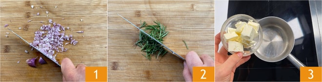 Para preparar las tagliatelle con setas y salchicha, comenzad con la mantequilla aromática: limpiad y picad la chalota 1. Picad también el romero fresco 2. En un cazo verted la mantequilla 3.