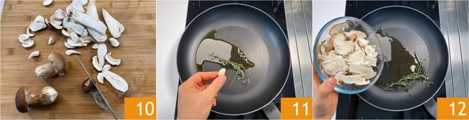 Cortadlas entonces en finas láminas 10. Calentad un poco de aceite en la sartén con el ajo y las ramitas de tomillo 11, luego echad las setas y salteadlas a fuego alto durante unos minutos 12. Cuando tengan un bonito color, añadid una pizca de sal.