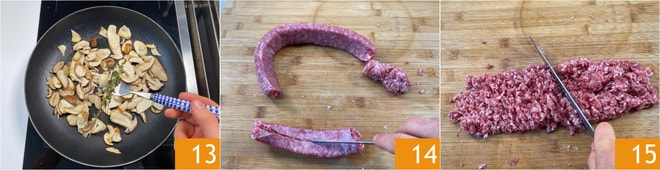 Eliminad los aromas 13 y reservad las setas en un bol para liberar la sartén. Abrid la luganega 14, retirad la tripa y picadla 15.