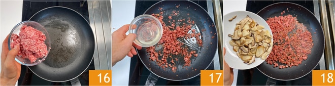 En la misma sartén, verted la salchicha 16. Cocinadla a fuego vivo hasta que se dore, luego añadid el vino blanco 17 y dejad que se evapore. Mientras tanto, coced las tagliatelle. Unid las setas en la sartén 18.