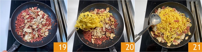 Saltead juntos setas y salchicha durante unos minutos 19, luego escurrid aquí las tagliatelle al dente 20, añadid un cucharón de agua de cocción de la pasta 21.