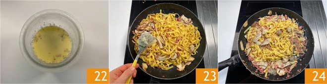 Ahora sacad la mantequilla aromática del congelador 22 y transferidla a la sartén 23, mezclad apagando el fuego, las tagliatelle con setas y salchicha están listas 24 para ser disfrutadas, ¡servidlas con una pizca de pimienta negra recién molida!