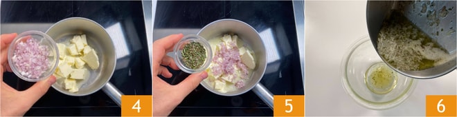 Incorporad la mezcla de chalota 4 y romero 5, sazonad con una pizca de sal. Removad y cocinad durante 5 minutos a fuego muy bajo. Verted la mezcla en un bol 6.