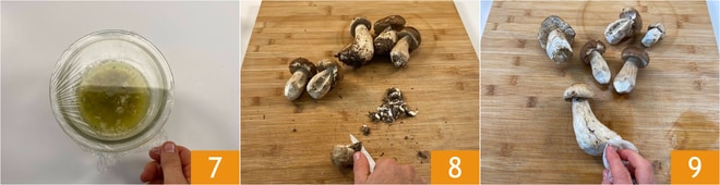 Cubrid con film y conservad en el congelador durante 30 minutos 7 mientras continuáis con la receta. Mientras tanto, Cómo limpiar los boletus eliminando con un cuchillo la parte terrosa y la base del tallo 8. Frotad el tallo suavemente con un paño o un cepillo para eliminar los restos que queden 9. Finalmente, pasad un pincel en el sombrero para eliminar las impurezas presentes.