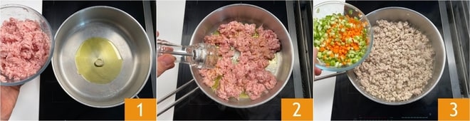 Para preparar las tagliatelle paglia e fieno con ragú de conejo, primero preparad un picadillo con zanahoria, apio y cebolla. Calentad en una cazuela un chorrito de aceite con un diente de ajo, luego añadid la carne picada de conejo 1, sal y pimienta 2. Dorad la carne a fuego medio-alto durante 5 minutos. Luego añadid el picadillo de verduras 3 y continuad dorando durante otros 5 minutos.
