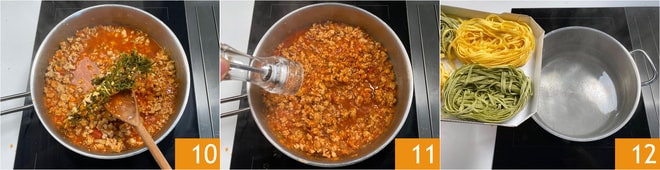 En este punto eliminad las hierbas aromáticas 10 y ajustad de sal y pimienta 11. Coced las tagliatelle paglia e fieno en agua hirviendo con sal 12.