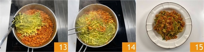 Escurridlas y trasferidlas directamente al condimento 13. Mezclad bien 14 y emplatad. Completad con una molienda de pimienta y unas hojitas de tomillo. ¡Vuestras tagliatelle paglia e fieno están listas para ser servidas 15!