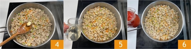Ahora eliminad el diente de ajo 4 y desglasad con el vino blanco 5. Cuando el alcohol se haya evaporado completamente, podréis añadir el puré de tomate 6.