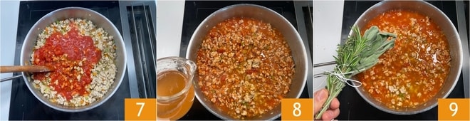 Mezclad bien 7, añadid el caldo caliente 8 y las hierbas aromáticas atadas juntas 9. Dejad cocinar durante 70 minutos a fuego medio-bajo, mezclando a menudo y añadiendo más caldo o agua si fuera necesario.