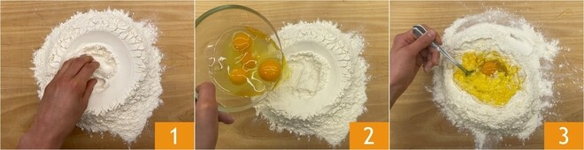 Para realizar los tagliolini con caviar, empezad con la pasta fresca: verted la harina sobre la superficie de trabajo, formad un hueco en el centro 1 y añadid los huevos poco a poco 2, mezclándolos con un tenedor 3.