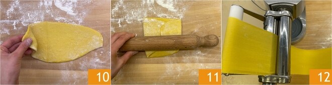 Dobláis los bordes exteriores de la masa hacia el centro 10, luego aplanadla de nuevo con el rodillo 11 y pasadla varias veces entre los rodillos de la máquina de pasta, reduciendo gradualmente el grosor hasta llegar al penúltimo 12.
