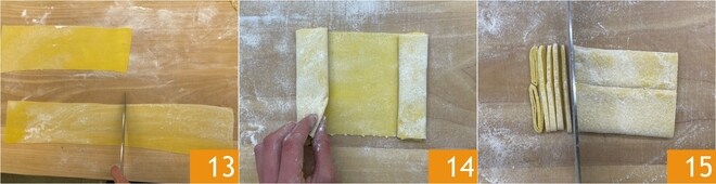 Obtened 3 rectángulos de las láminas obtenidas 13 y espolvoread con harina, luego enrollad los lados cortos sobre sí mismos hasta llegar al centro 14. Cortad la masa así enrollada en tiras de 2-3 mm de ancho 15.