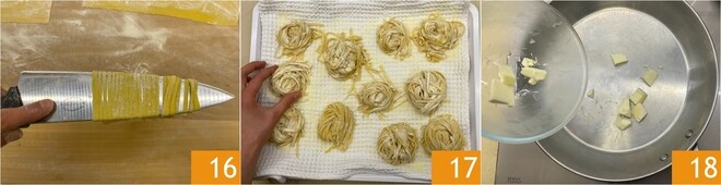 Levantad los tagliolini con la hoja del cuchillo 16, formad nidos y colocadlos en una bandeja espolvoreada con sémola 17. En este punto, poned al fuego una olla de agua para hervir y salar para cocinar los tagliolini. Mientras tanto, derretid la mantequilla en una sartén grande 18.