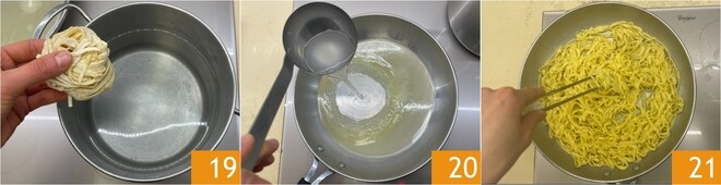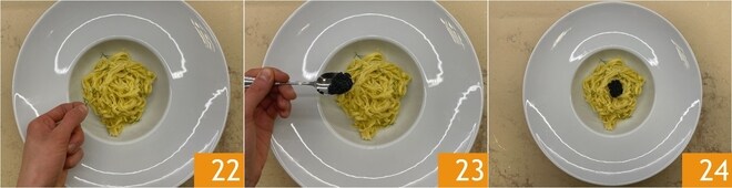 Sumergid los nidos de tagliolini y cocinad durante 1-2 minutos 19, mientras tanto verted un cucharón del agua de cocción en la sartén con la mantequilla derretida 20 y mezclad para crear una emulsión. Escurrid los tagliolini directamente en la sartén y salteadlos con el aderezo 21.