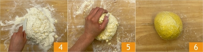 Ayudaos con una rasqueta para recoger toda la mezcla 4 y continuad trabajando con las manos 5, hasta obtener una masa lisa y homogénea. Envolved la masa en film transparente y dejad reposar en un lugar fresco durante 30 minutos 6.