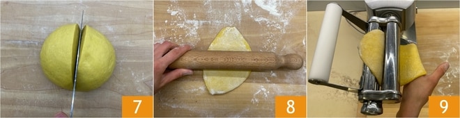 Transcurrido el tiempo de reposo, dividid la masa por la mitad 7 y aplanad una de las 2 partes con el rodillo sobre la superficie enharinada 8, luego pasadla entre los rodillos de la máquina de pasta en el grosor más amplio 9; recordad envolver en film transparente la parte de la masa que no estáis usando para evitar que se seque.