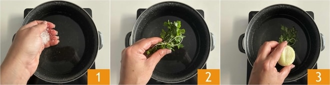 Para preparar los takoyaki, comienza con la cocción del pulpo: llena una olla con abundante agua, luego añade una pizca de sal 1, un ramillete de perejil 2 y la cebolla 3.