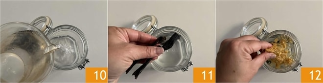 Dedícate al caldo dashi: vierte el agua en un frasco de vidrio 10, luego añade el alga kombu 11 y el katsuobushi 12.