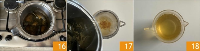 Deja hervir a fuego lento durante unos minutos 16; solo deberá calentarse ligeramente para que los sabores se mezclen mejor. Apaga el fuego y cuela el caldo obtenido 17. Pesa 250 g de dashi para la preparación de la masa y deja enfriar 18.