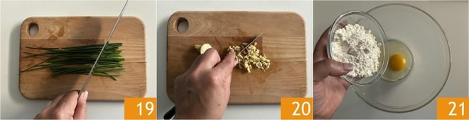 Ahora pica finamente el cebollino 19 y el jengibre 20. Por último, prepara la masa: en un bol grande, vierte el huevo y la harina 21.