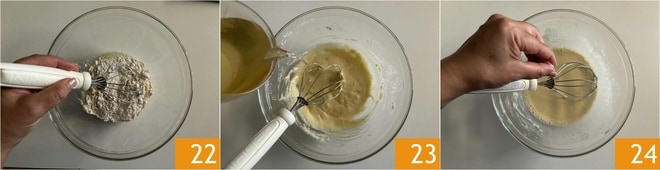 Mezcla bien con un batidor 22, luego añade los 250 g de dashi en hilo continuo mientras sigues mezclando con el batidor 23. Cuando hayas obtenido una masa suave y homogénea, ajusta de sal 24.