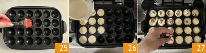 Estás listo para la cocción: unta la plancha para takoyaki con un poco de aceite vegetal 25, luego colócala sobre el fuego con un difusor de llama y caliéntala bien. Con la ayuda de una jarra con pico, o con un cucharón, llena los moldes con la masa preparada 26. Inserta de inmediato en cada molde los trozos de pulpo 27, cebollino 35 y jengibre 36.