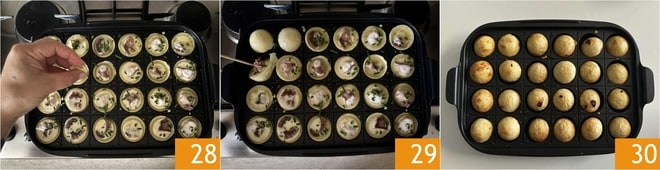 Distribuye también el cebollino y el jengibre picados 28. Cocina los takoyaki durante unos 7-8 minutos a fuego alto, luego voltéalos con la ayuda de un palillo 29 y cocínalos el mismo tiempo por el otro lado. Si es necesario, voltéalos de vez en cuando hasta que estén completamente dorados 30.