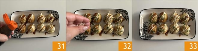 Transfiere los takoyaki cocidos a un plato y decóralos con mayonesa y salsa okonomiyaki 31. Completa con semillas de sésamo blanco y negro 32 y un poco de cebollino. ¡Tus takoyaki están listos para ser disfrutados 33!