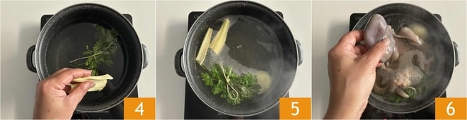 Añade también el apio 4 y lleva a ebullición 5. Una vez que el agua comience a hervir, sumerge el pulpo y cocínalo durante unos 40 minutos 6.