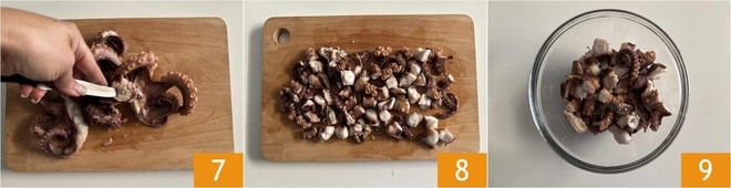 Pasado el tiempo de cocción del pulpo, escúrrelo y elimina el diente en el centro de los tentáculos, si aún está presente 7, luego corta la carne en trozos 8. Transfiere el pulpo a un bol y reserva 10.