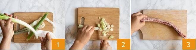 Para preparar los tallarines con cebolletas y salchicha, asegúrate de tener listo el caldo de carne (necesitarás 3 cucharones); luego elimina las hojas exteriores y la parte más verde de las cebolletas 1, después córtalas en rodajas 2. Haz un corte a lo largo en la tripa de la salchicha 3