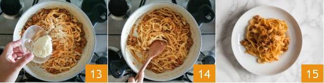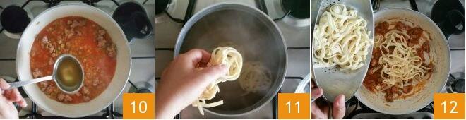 Vierte un par de cucharones más de caldo 10 y cocina durante unos 10 minutos. Mientras tanto, lleva a ebullición agua con sal para cocinar los tallarines. Cocina los tallarines al dente 11, luego escúrrelos y échalos directamente en la sartén 12.
