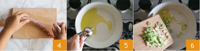 Y retírala de la carne 4. En una cazuela calienta el aceite de oliva 5, luego añade las cebolletas 6, sala, pimienta y deja dorar unos minutos para ablandarlas.