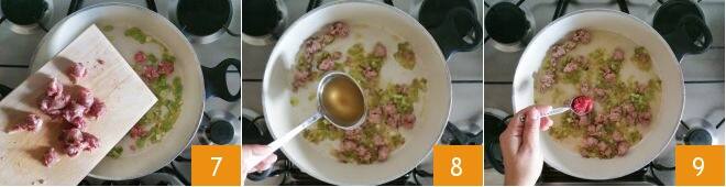 Añade la salchicha ligeramente desmenuzada 7, saltea durante un par de minutos y agrega un poco de caldo de carne caliente 8. Añade el concentrado de tomate 9 y mezcla bien para incorporarlo.
