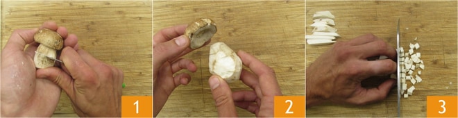 Para preparar los tallarines con sepias y setas empieza por la limpieza de los porcini, rasca con la ayuda de un cuchillito el tallo de las setas 1, y pasa el sombrero con un trozo de papel húmedo para quitar el exceso de tierra. Es bueno que los porcini toquen el menor agua posible. En este punto separa los sombreros de los tallos 2. Corta los tallos en pequeños cubos 3.