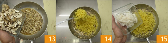 Añade el resto de las setas 13. Mientras tanto, cuece la pasta que escurrirás bien al dente directamente en la sartén 14. Termina la cocción de la pasta añadiendo el resto de las sepias 15.