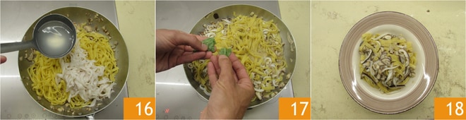 Añade también agua de cocción, la necesaria 16. Termina con un chorrito de aceite y el tomillo deshojado 17. Los tallarines con sepias y setas están listos 18.