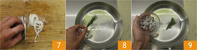 Corta el resto a lo largo en tiras 7. Deshoja algunas ramitas de tomillo que usarás para ligar. Calienta muy bien un chorrito de aceite en una sartén, añade la ramita de romero y el diente de ajo 8, pon los penachos de las sepias picadas 9.