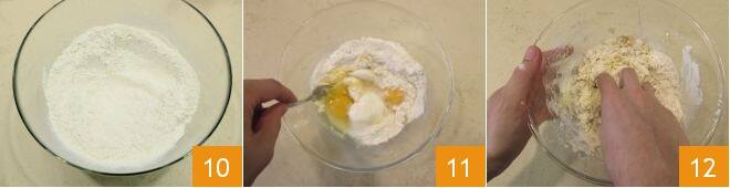 Ahora procede con la preparación de la pasta fresca. Toma un bol y vierte la harina tamizada 10. Crea con la harina la forma de fuente y, después de hacer una pequeña depresión en el centro, vierte los huevos 11 y ajusta con una pizca de sal. Comienza a mezclar los ingredientes, incorporando a los huevos la harina poco a poco y ampliando así el círculo 12. Cuando hayas incorporado todos los ingredientes, toma la mezcla y colócala sobre una tabla de amasar. Trabájala con las manos durante al menos 10 minutos hasta obtener una mezcla suave y homogénea.